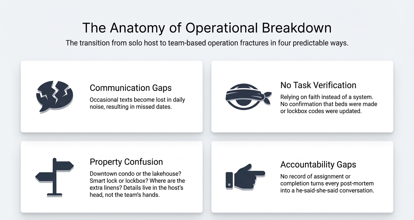 Text message coordination works when it's occasional. When turnovers are happening twice a week across two properties, texts become a liability. There's no shared record, no task status, and no way for anyone else to see what's been communicated.