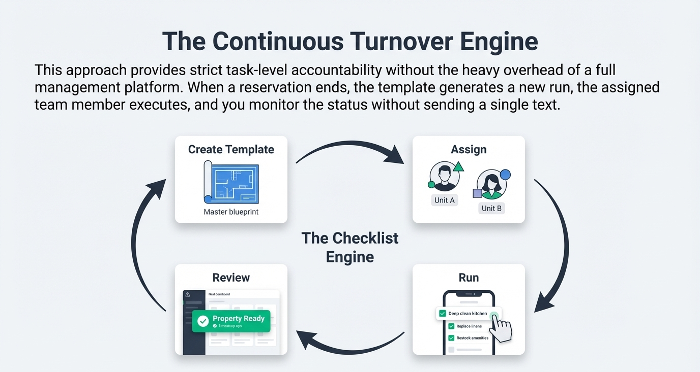 But for the host with one to three properties and a small cleaning team, a PMS is overkill. What you need is structured task management, team assignments by property, and a way to verify that work was done. That's a checklist system, not an enterprise platform.