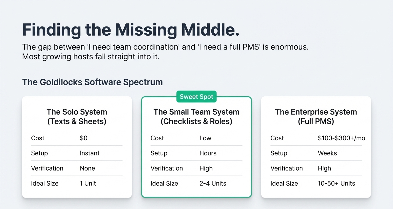 The gap between "I need team coordination" and "I need a full PMS" is enormous, and most hosts fall into it.