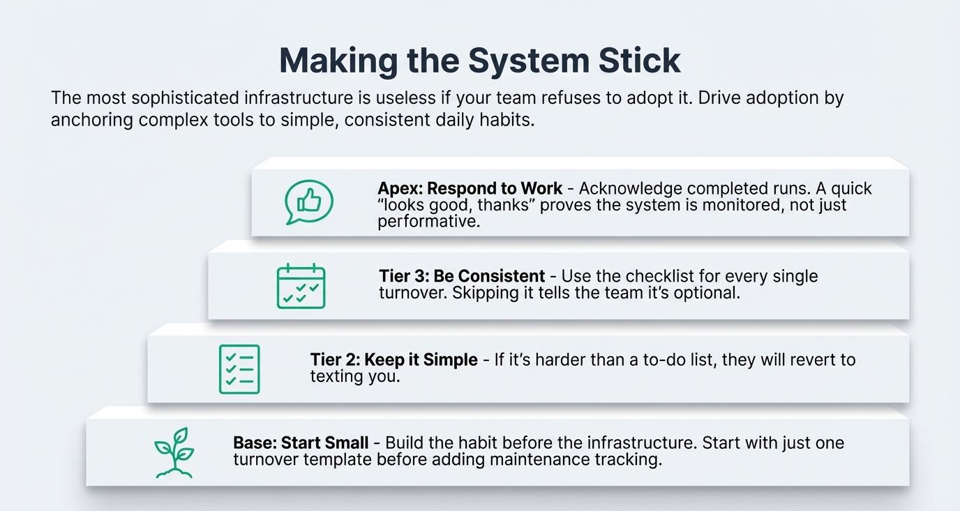 Respond to completed checklists. When someone finishes their tasks, acknowledge it. A quick "looks good, thanks" reinforces the habit. Ignoring completed work tells your team that the system is performative.
