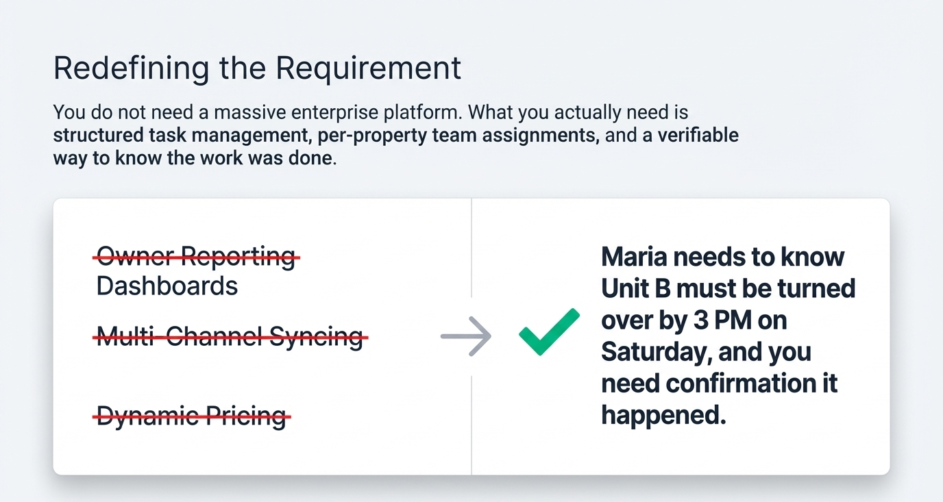 The gap between "I need team coordination" and "I need a full PMS" is enormous. Most growing hosts fall straight into it.