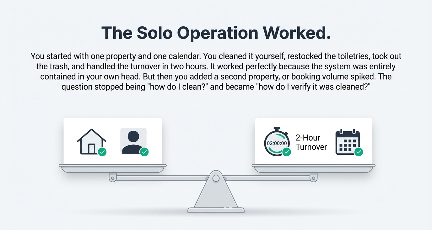 You started with one property. You cleaned it yourself between guests, restocked the toiletries, took out the trash, and handled turnover in two hours. It worked because it was just you and one calendar to watch.