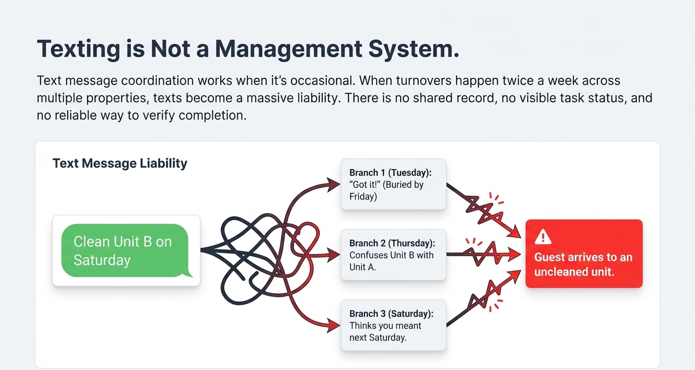 Text message coordination works when it's occasional. When turnovers happen twice a week across multiple properties, texts become a liability.